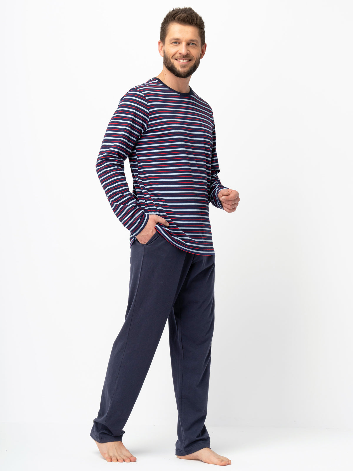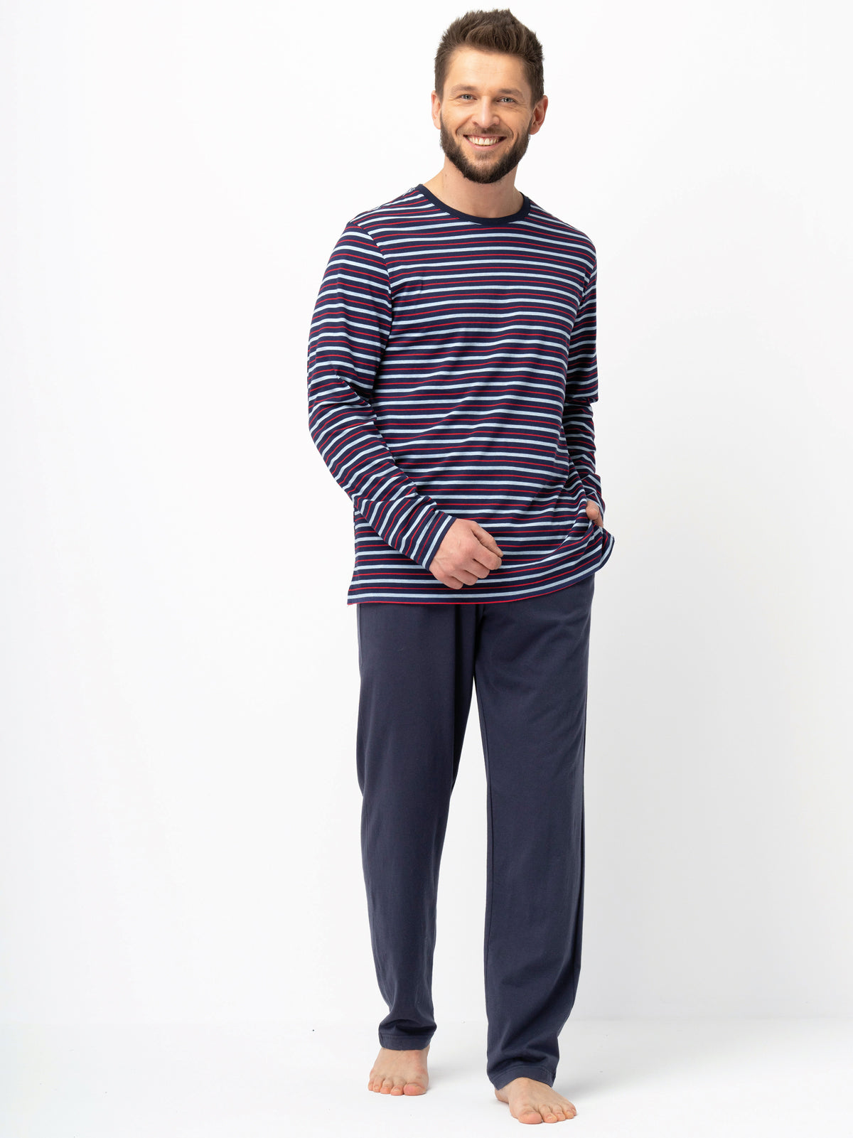Ciekawe połączenie głębokiego granatu, szarego melanżu i czerwieni przenika się w motywie pasków - jest męska i bardzo twarzowa. Piżama w całości wykonana z niezwykle miękkiej, wysokiej jakości dzianiny bawełnianej. 100% naturalne włókno zapewnia ciepło i bardzo wysoki komfort użytkowania piżamy. Miękka i przyjemna w dotyku bawełna to wygodna, całoroczna propozycja. Bluza z okrągłym dekoltem wykończonym dzianiną rib, dzięki czemu dekolt zachowuje kształt nawet po wielu praniach. Gładkie spodnie o kroju lekko zwężającej się nogawki mają w pasie wygodną, miękką gumę. Bawełniane troczki pozwalają na dopasowanie szerokości pasa do potrzeby Ciała. Po bokach głębokie kieszenie. Piżama klasyczna i bardzo wygodna!