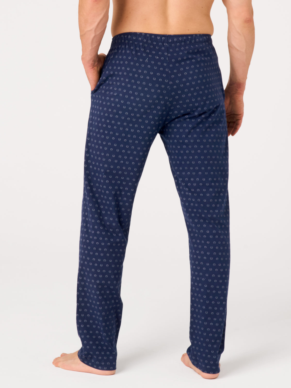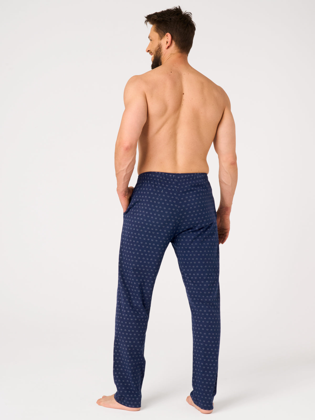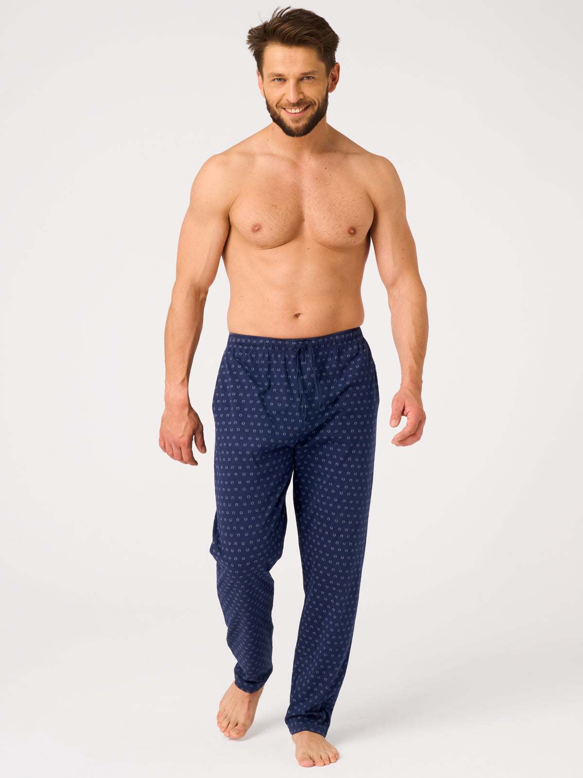 Spokojny granat i drobny rysunek podkowy, która na pewno przyniesie szczęście :) Klasyczne spodnie o lekko zwężanym kroju nogawki - z wygodną, miękką gumą i troczkiem w pasie. Po bokach głębokie kieszenie. Włókna w 100% bawełniane wysokiej jakości w połączeniu z odpowiednim ściegiem i nićmi gwarantują wyjątkową trwałość i sprawiają, że spodnie na długo zachowują swoją formę. Miękka i przyjemna w dotyku bawełna to wygodna, całoroczna propozycja. Spodnie mają uniwersalne zastosowanie - doskonałe do spania, jak i na wszystkie chwile relaksu i radości w domu!
