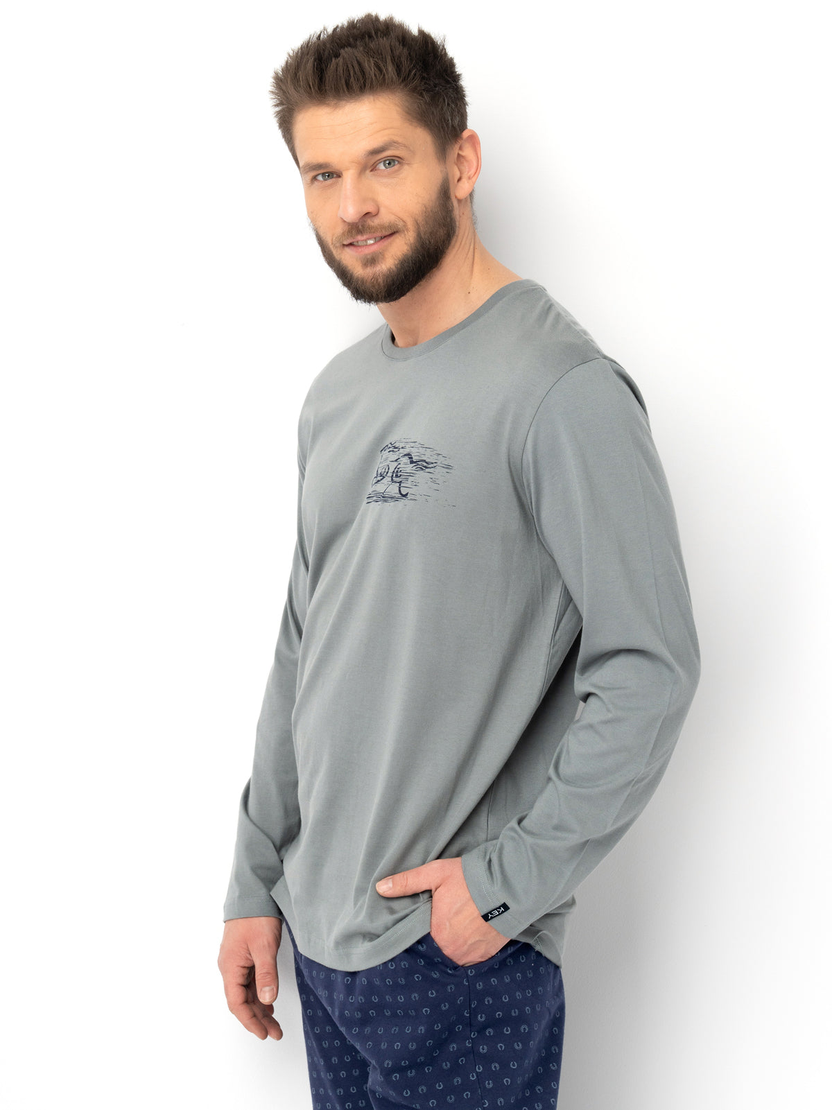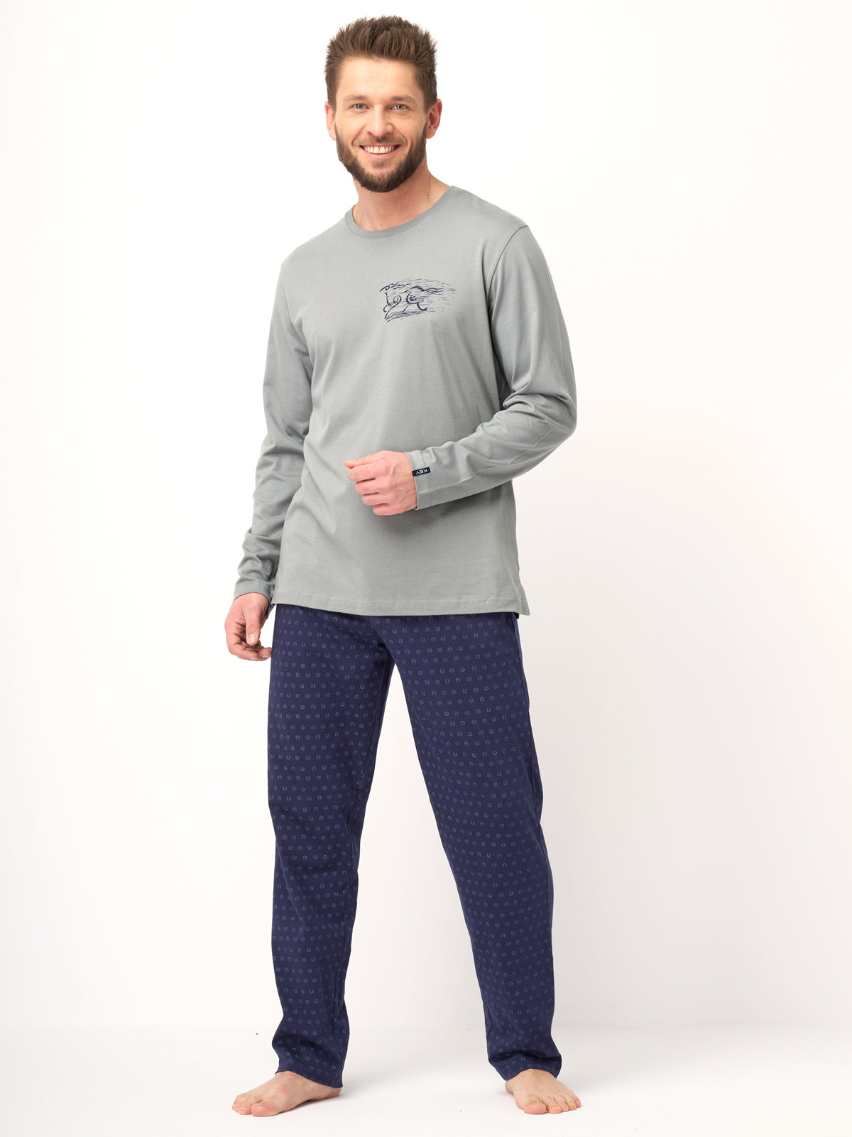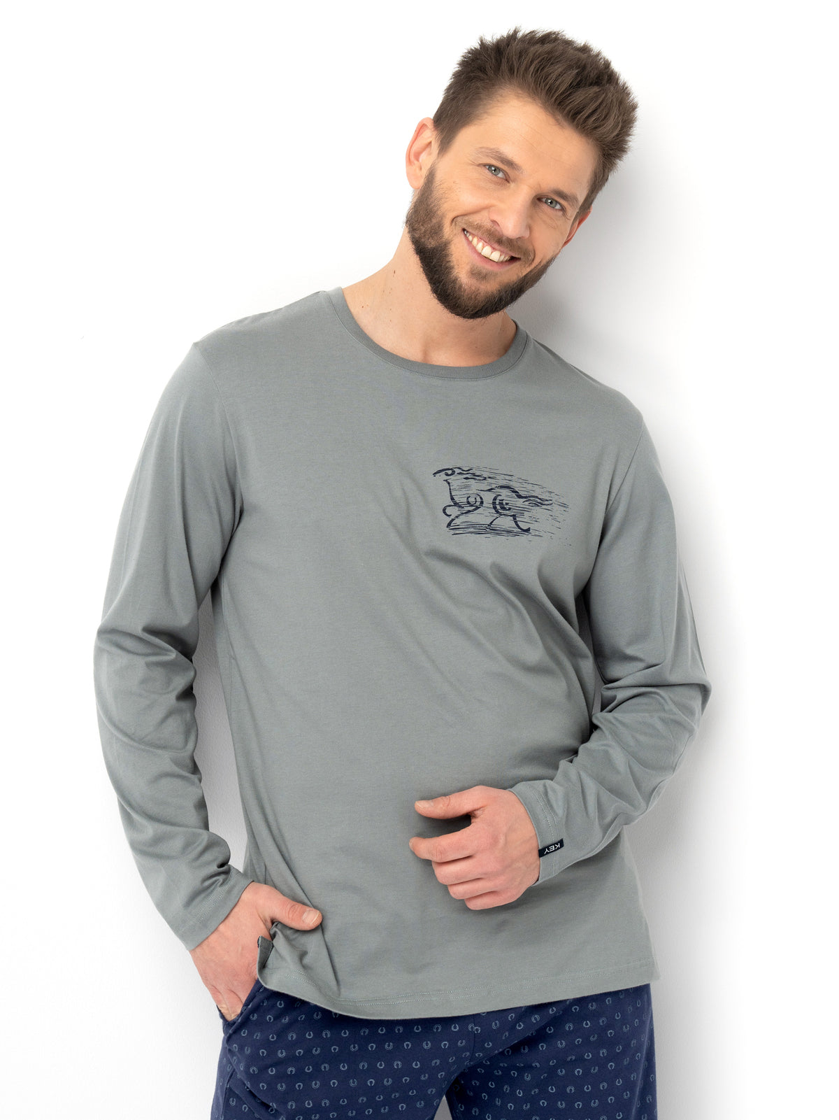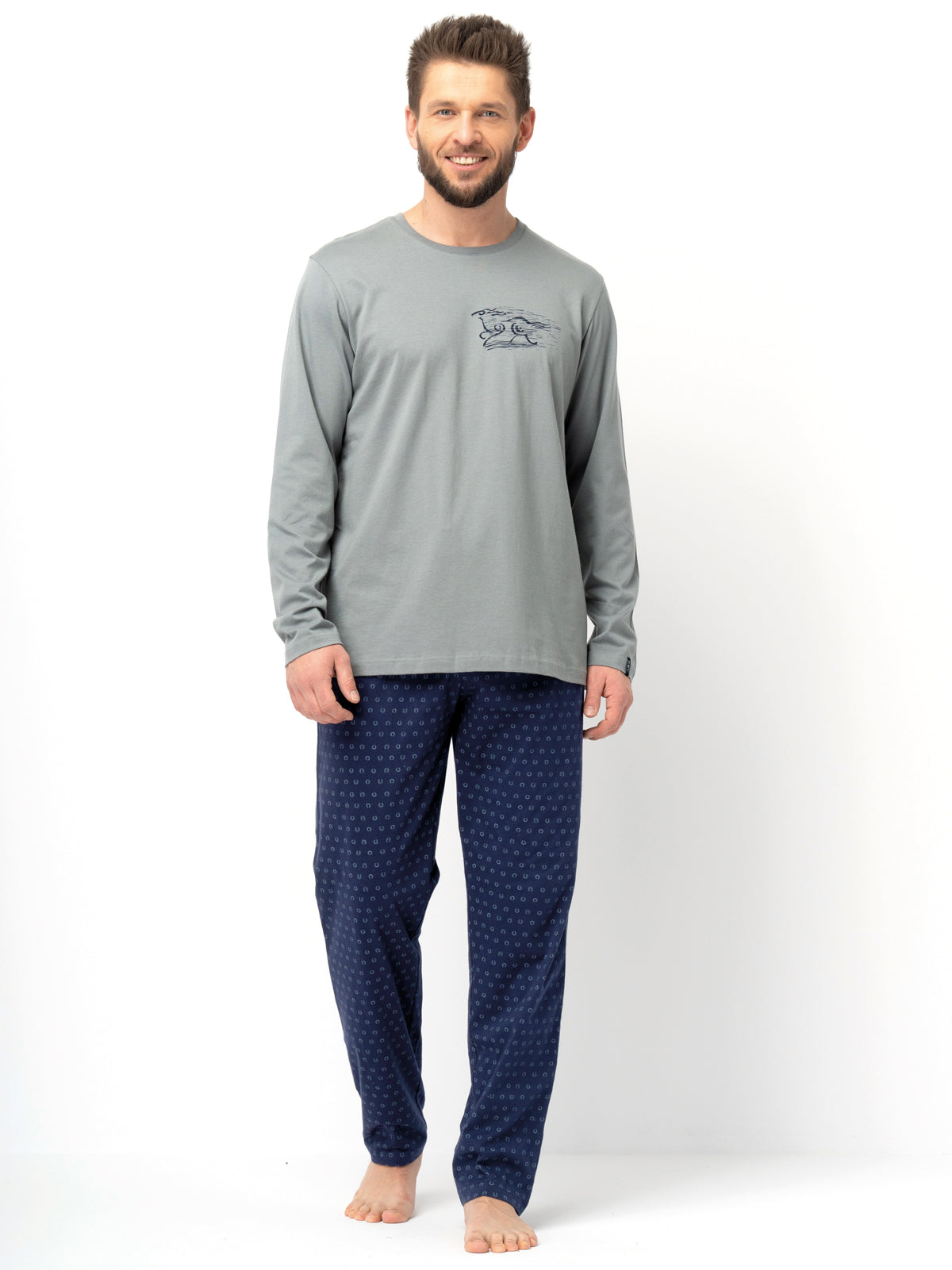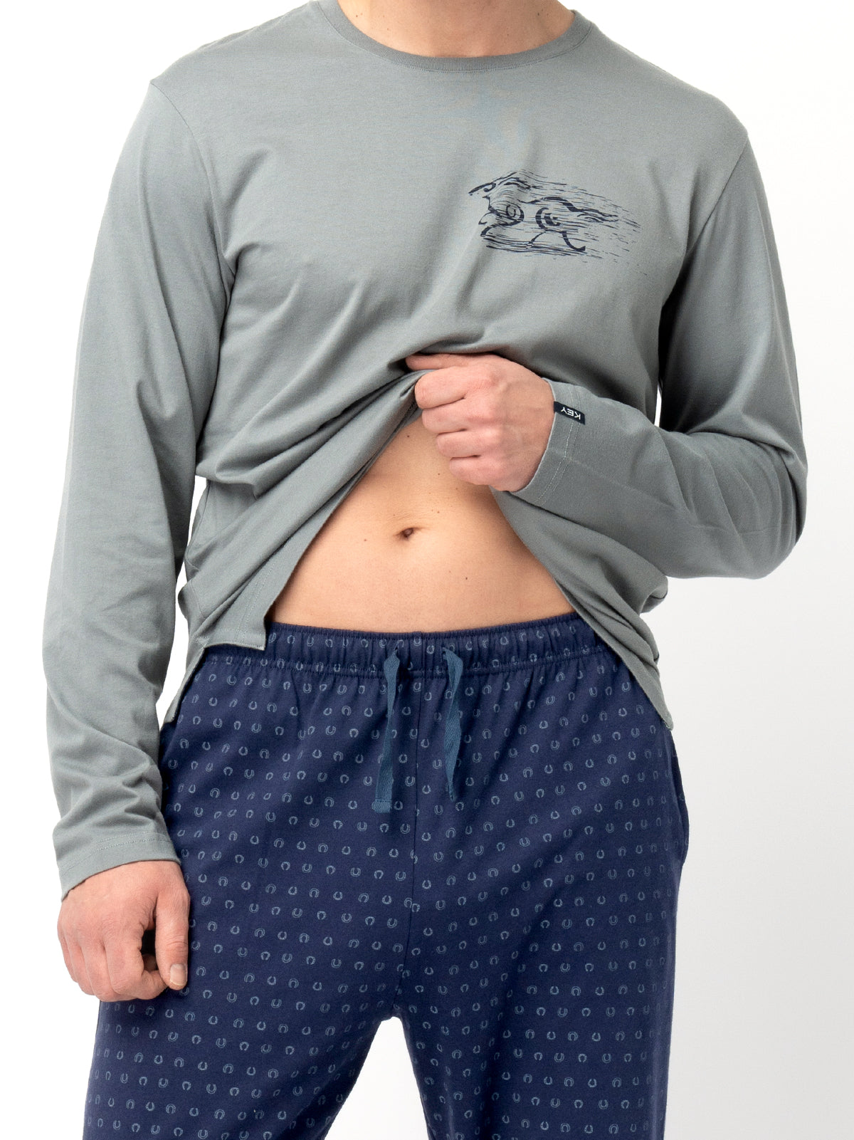 Wykonana w całości z miękkiej dzianiny bawełnianej wysokiej jakości, która zapewnia komfort noszenia, swobodę ruchów i trwałość. Klasyczny krój góry i dołu. Bluza z okrągłym dekoltem, z rysunkowym motywem galopującego konia. Gładkie spodnie o kroju lekko zwężającej się nogawki mają w pasie wygodną, miękką gumę. 100% bawełniane spodnie. Spokojny granat i drobny rysunek podkowy, która na pewno przyniesie szczęście :) Wygodne spodnie o prostym kroju nogawki z miękką gumą i troczkiem w pasie. Po bokach głębokie kieszenie. Włókna w 100% bawełniane wysokiej jakości w połączeniu z odpowiednim ściegiem i nićmi gwarantują wyjątkową trwałość i sprawiają, że piżama na długo zachowują swoją formę. Miękka i przyjemna w dotyku bawełna to doskonała propozycja na każdą porę roku. Całość ciekawa, nowoczesna i bardzo wygodna.