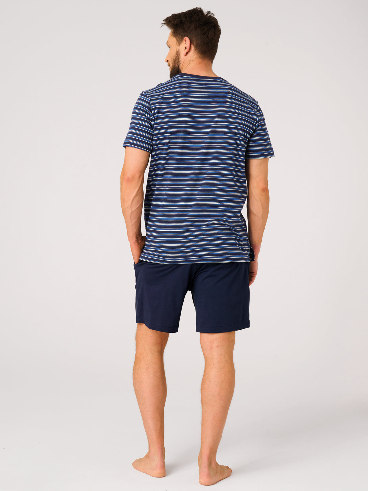 Dodatkowo, głębokie kieszenie po bokach zwiększają funkcjonalność zestawu. Klasyczny krój i przewiewny materiał sprawiają, że piżama jest wyjątkowo wygodna, lekka i praktyczna do codziennego noszenia. To uniwersalny komplet, który łączy trwałość, naturalność i swobodę ruchów, doskonały dla każdego mężczyzny ceniącego wygodę i komfort.