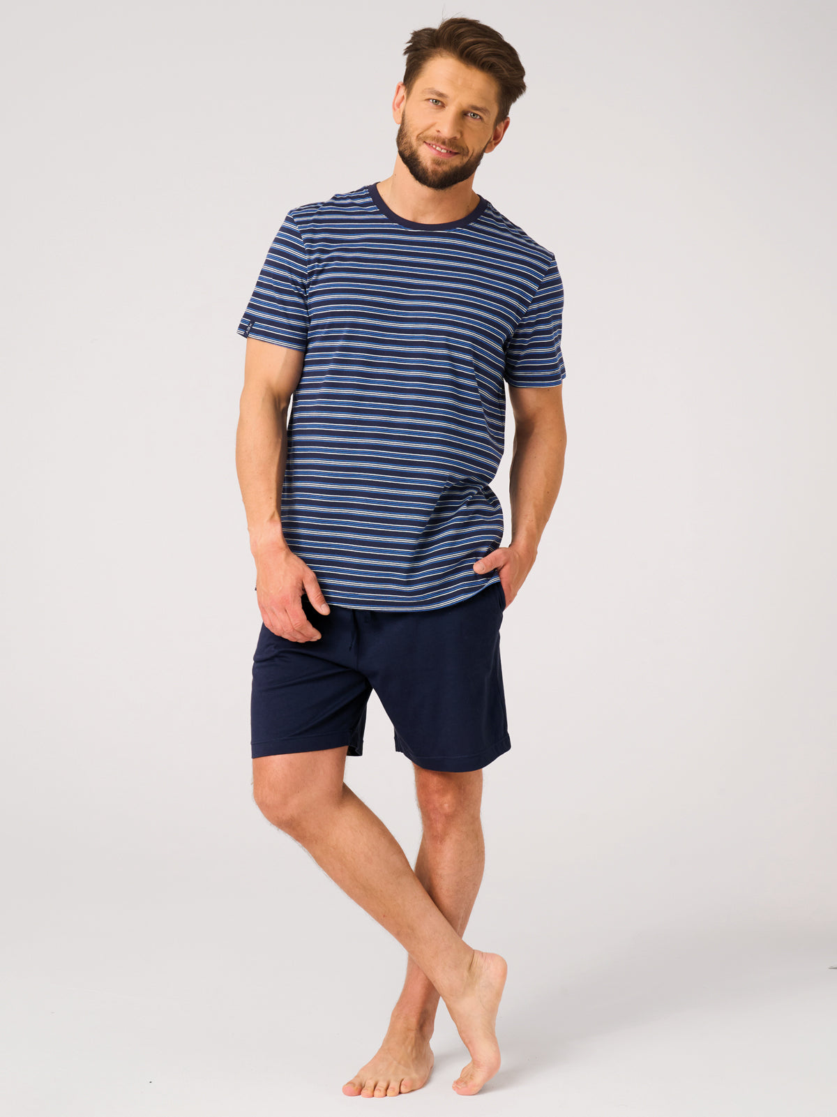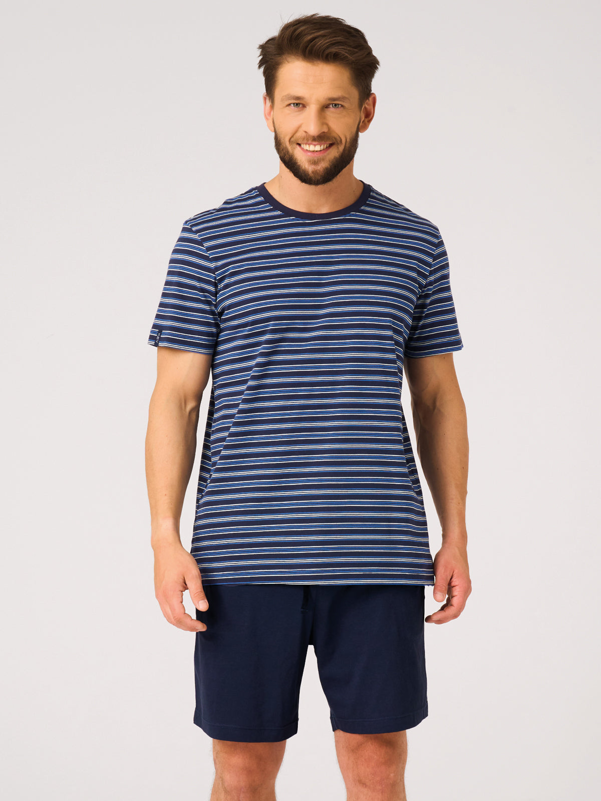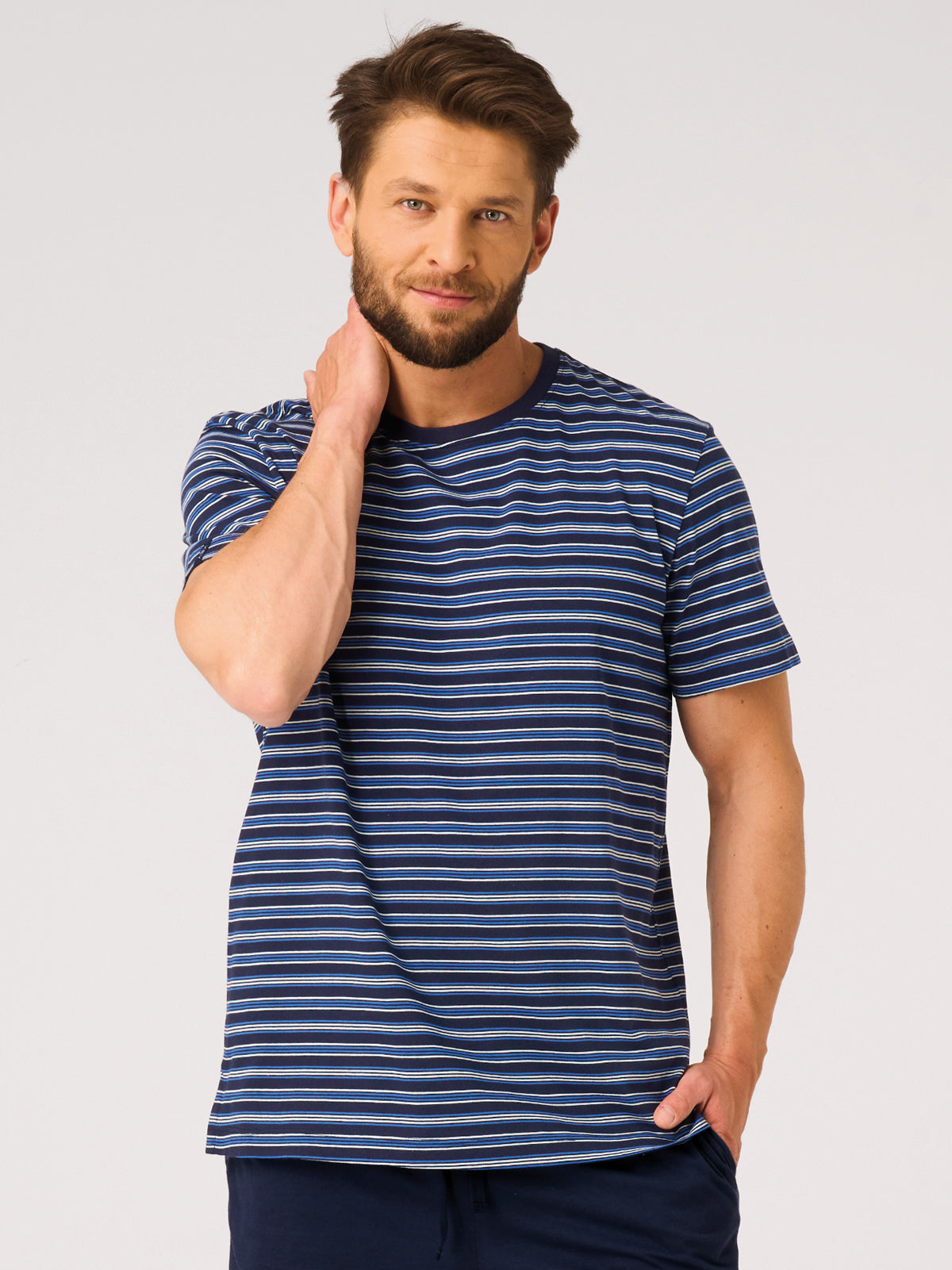 Kolorystyka tworzy harmonijny, przestrzenny efekt pasków i nadaje piżamie uniwersalny charakter. Całość uszyta została z wysokiej jakości, miękkiej 100% dzianiny bawełnianej, która jest przyjemna w dotyku i gwarantuje komfort przez całą noc. Naturalne włókna bawełny wspomagają oddychanie skóry, zapewniając optymalną temperaturę ciała i wygodę użytkowania.