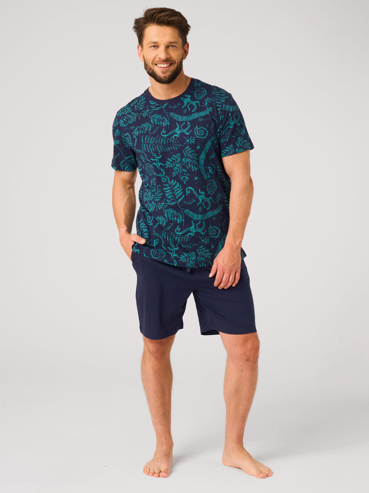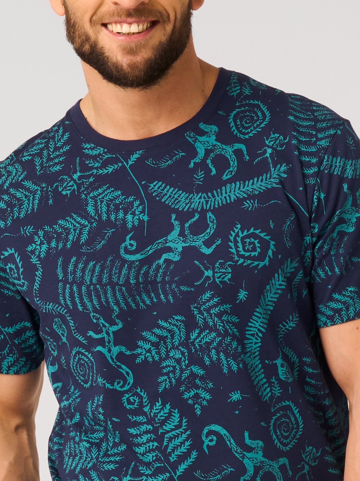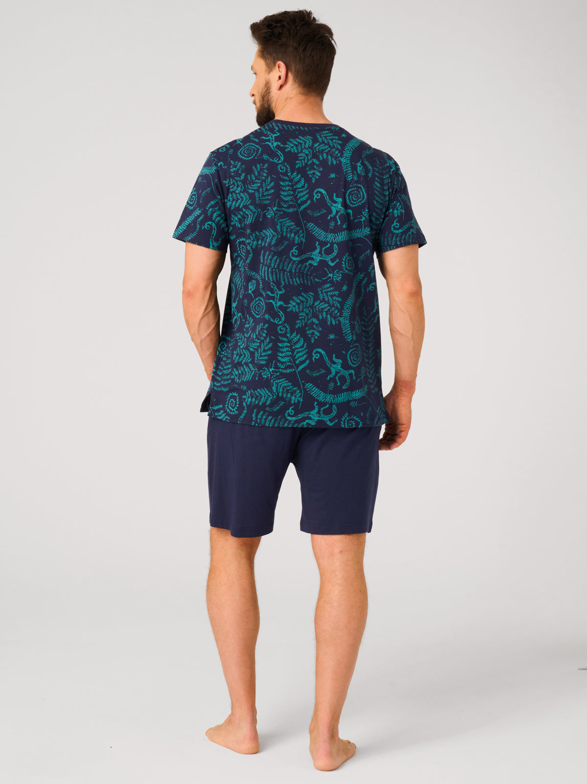 Koszulka na granatowym tle została ozdobiona turkusowymi paprociami, jaszczurkami i liśćmi, tworząc niepowtarzalną, pełną uroku opowieść prosto z lasu. Wyjątkowy, szczegółowy wzór wyróżnia się ciekawym kontrastem na ciemnym tle, nadając piżamie charakteru i unikalnego stylu.