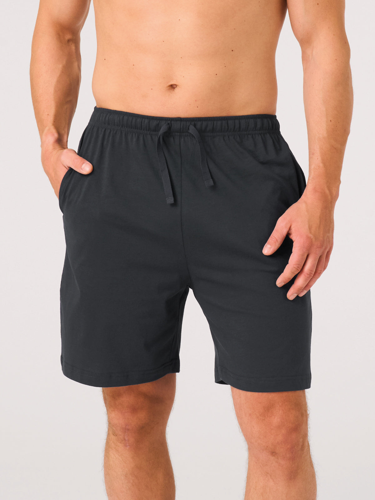 Koszulka posiada klasyczny okrągły dekolt wykończony dzianiną rib, co utrzymuje jej fason w nienaruszonym stanie przez długi czas. Dół koszulki ma boczne pęknięcia wzmocnione ozdobną, bawełnianą taśmą, zapewniające większą swobodę ruchów. Proste, gładkie spodenki mają w pasie miękką gumę, a dodatkowe bawełniane troczki pozwalają idealnie dopasować obwód pasa do sylwetki. Po bokach znajdują się głębokie kieszenie, które zwiększają funkcjonalność kompletu.