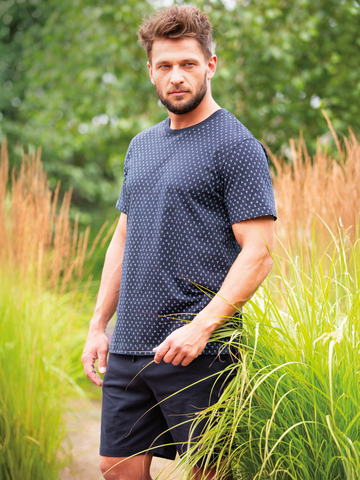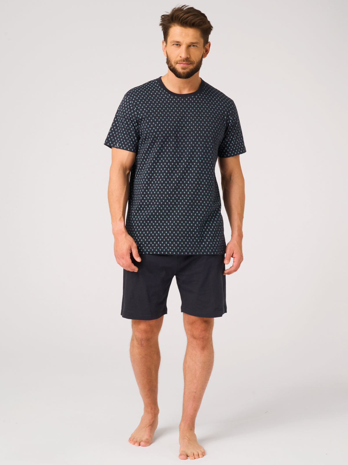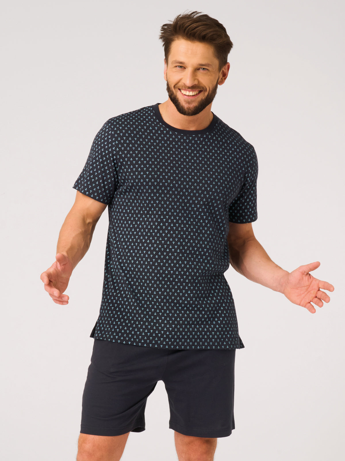 Męska piżama bawełniana Key w kontrastowej kolorystyce – głęboki granat przełamany radosnym turkusem w motywie kotwic tworzy energetyczny i ciekawy wygląd.