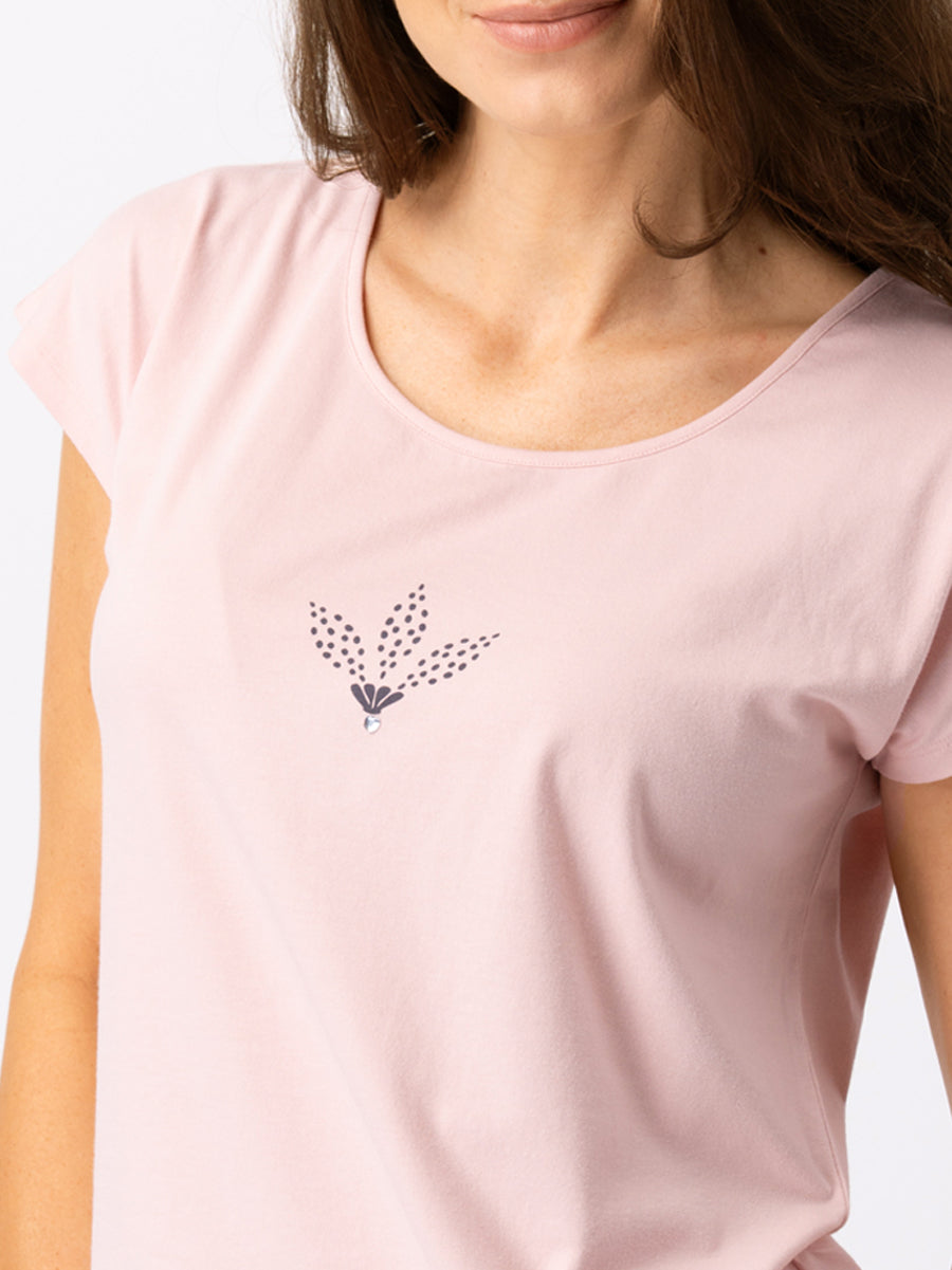 Pastelowa bluzka o prostym kroju gwarantuje swobodę ruchów. Subtelny etno kwiat z migoczącą cyrkonią na środku piżamki. Dzianina bawełniana z dodatkiem elastanu dopasowuje się do Ciała i gwarantuje swobodę ruchu Proste spodnie z miękką gumą w pasie i bocznymi kieszeniami są praktyczne i bardzo wygodne. Długość do połowy łydki. Motyw inspirowany sztuką ludową wspiera kobiecą siłę i moc. Piękna piżama na każdy wieczór i poranek!