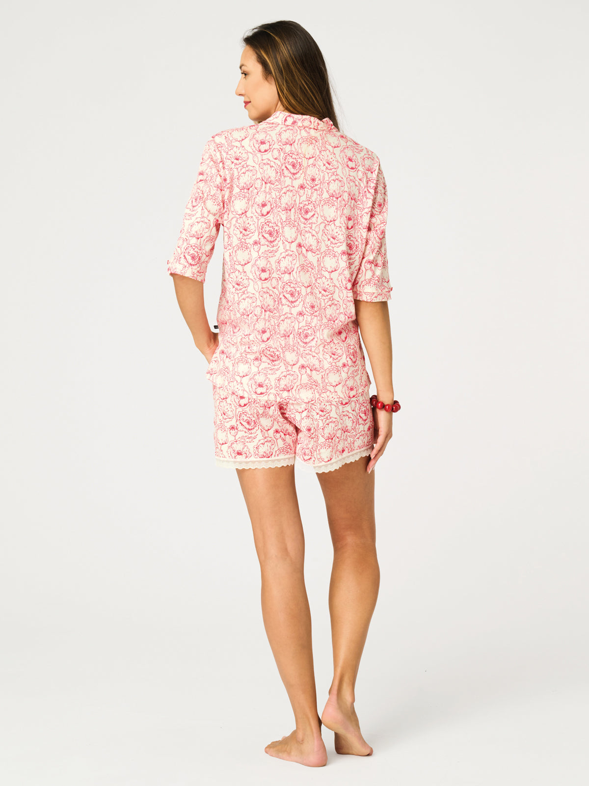 Góra piżamy ma dopasowany, wygodny fason, który delikatnie podkreśla sylwetkę i zapewnia swobodę ruchów. Krótki rękawek sięgający za łokieć nadaje subtelnej elegancji. Spodenki o krótkiej, prostej nogawce wykończono delikatną koronką, dodając romantycznego uroku. W pasie znajduje się miękka guma dla komfortowego dopasowania. Funkcjonalne kieszenie zwiększają wygodę użytkowania. Całość gwarantuje luz i swobodę zarówno podczas snu, jak i domowego relaksu.