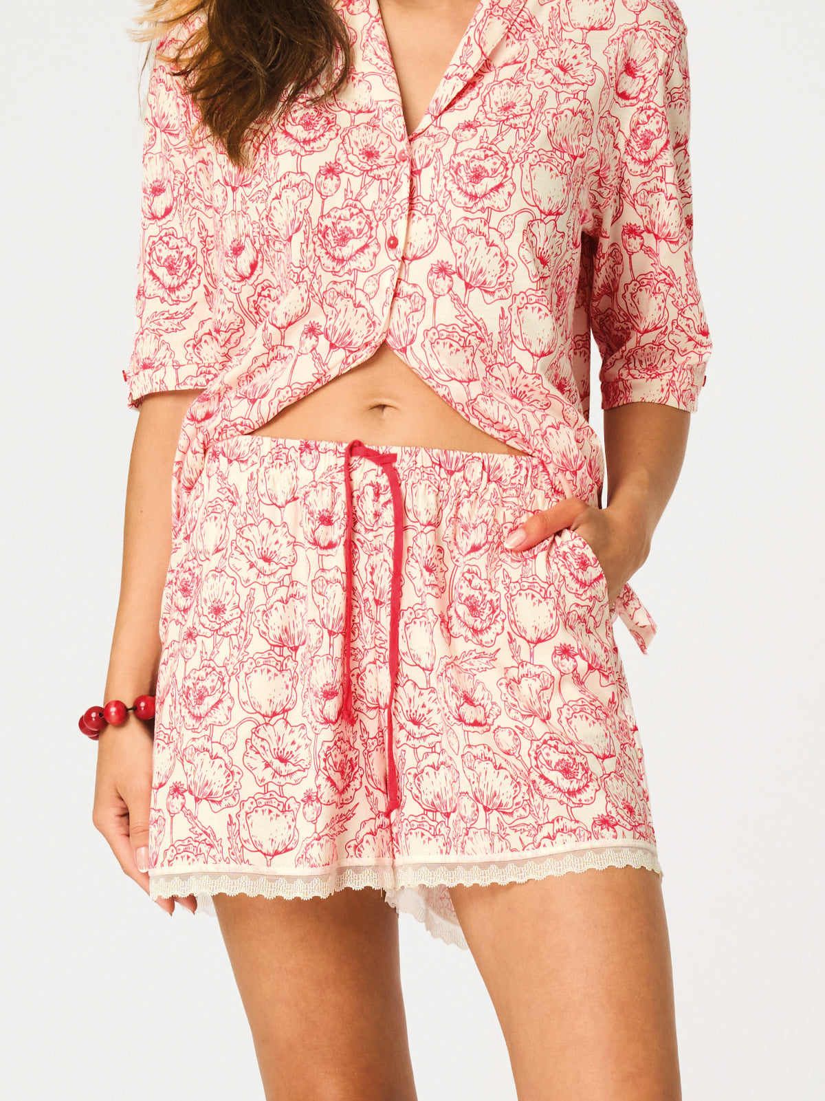 Głęboka czerwień odręcznie rysowanych maków na śmietankowym tle tworzy wyrazistą, świeżą kompozycję. Maki w tradycji słowiańskiej symbolizują szczęście, płodność i ochronę. Czerwony to kolor Życia - dodaje siły, pasji i pozytywnej energii. Kwiatowy motyw inspirowany naturą podkreśla subtelny, a zarazem wyrazisty charakter całości. Kontrast barw nadaje lekkości i wyjątkowej kobiecości. To piżama, która łączy artystyczny detal z ponadczasową elegancją.