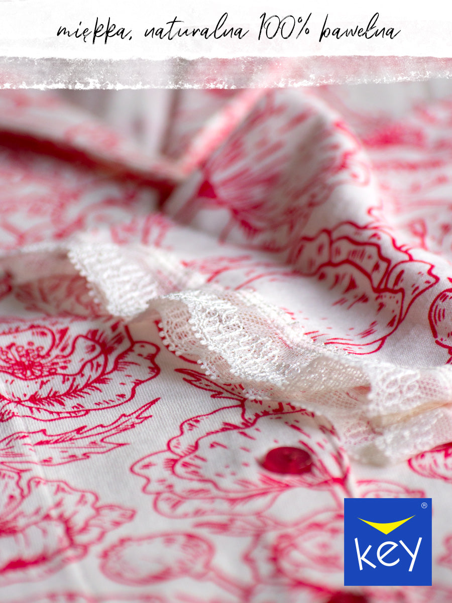 Elegancka i niezwykle kobieca piżama damska z 100% bawełny przyciąga uwagę wyrazistą energią koloru i szlachetnością detalu.