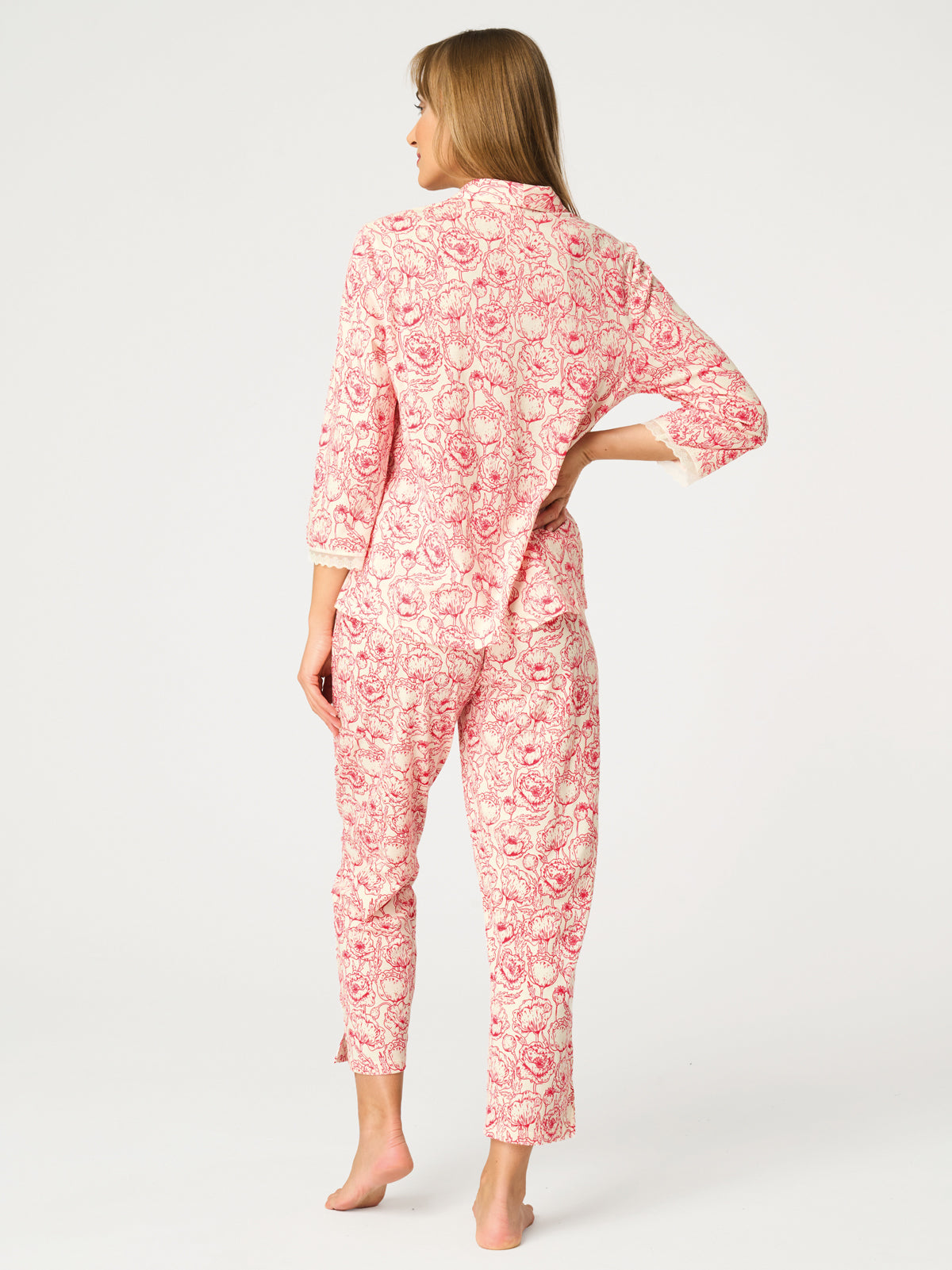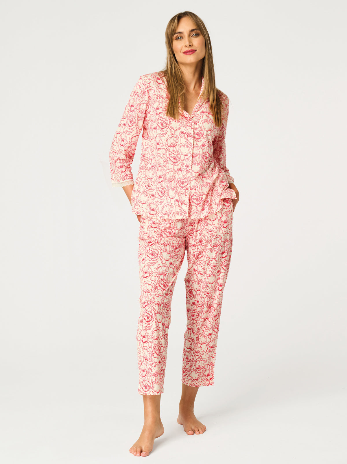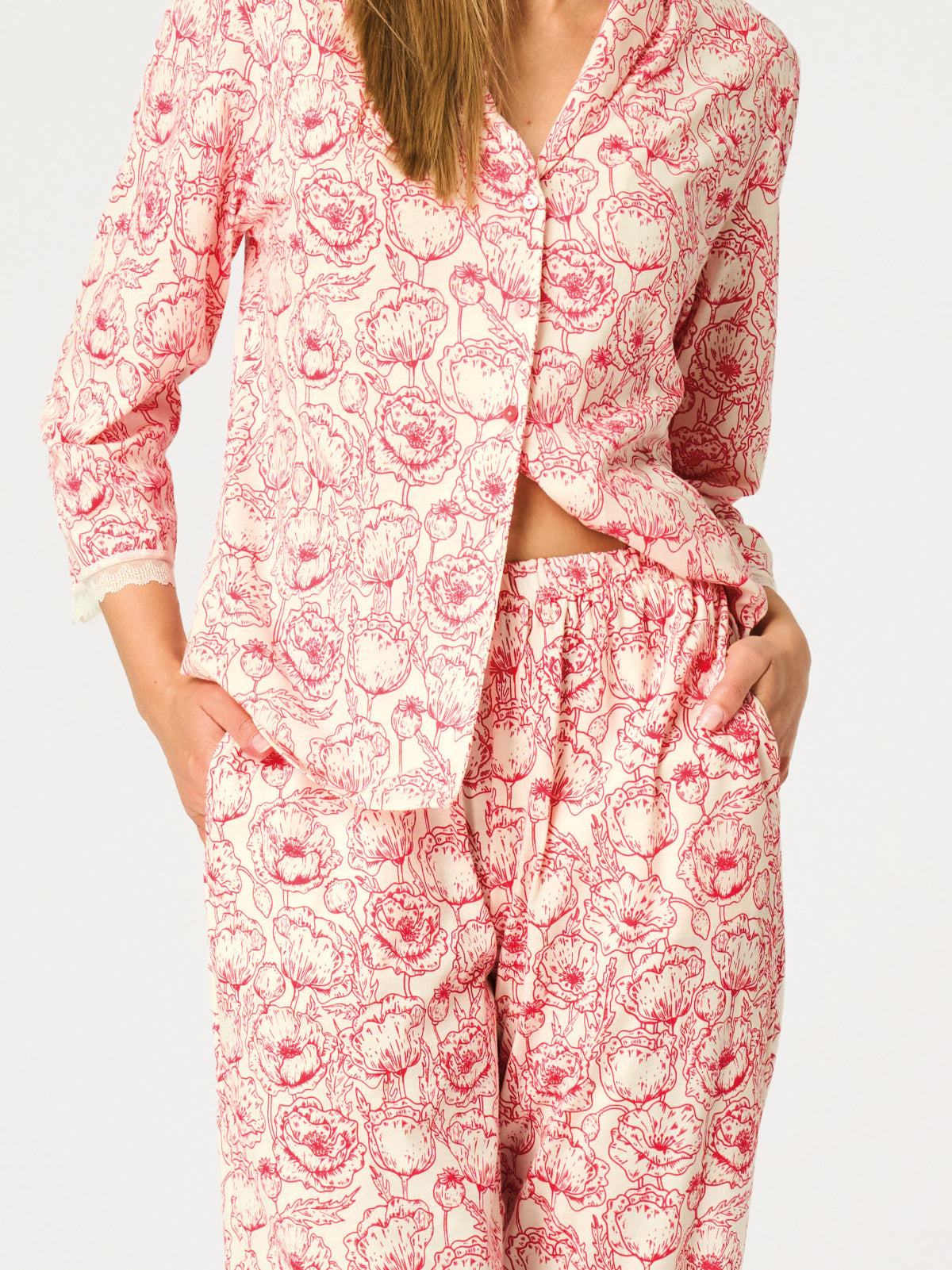 Góra piżamy ma dopasowany, komfortowy fason i jest zapinana na guziki, co dodaje jej klasycznej elegancji oraz funkcjonalności. Rękaw sięgający za łokieć wykończony został delikatną koronką, podkreślając romantyczny styl modelu. Spodnie z prostą nogawką o długości 7/8 zapewniają wygodę oraz nieskrępowane ruchy. W pasie zastosowano miękką gumę, która dobrze dopasowuje się do sylwetki bez uczucia ucisku. Praktyczne kieszenie zwiększają komfort użytkowania na co dzień. Zestaw świetnie sprawdzi się zarówno jako piżama, jak i stylowy komplet domowy typu homewear. Model dostępny jest do rozmiaru 2XL.