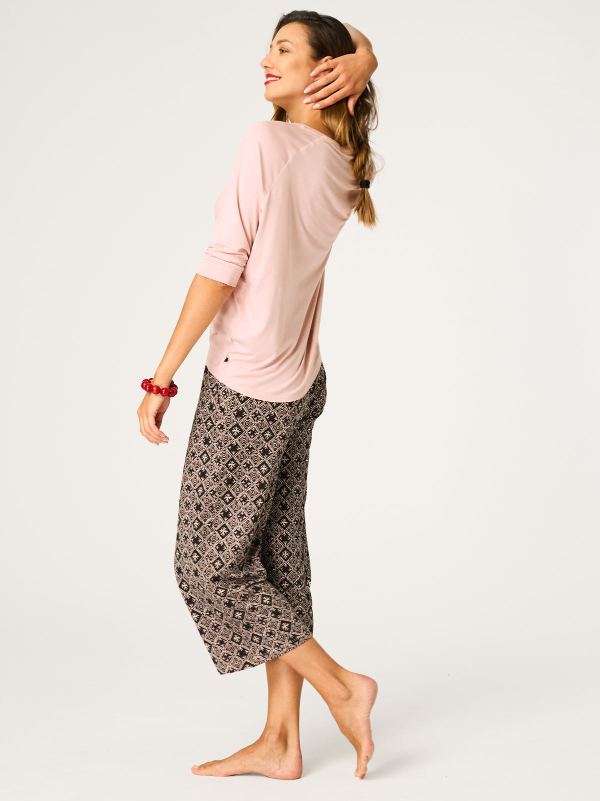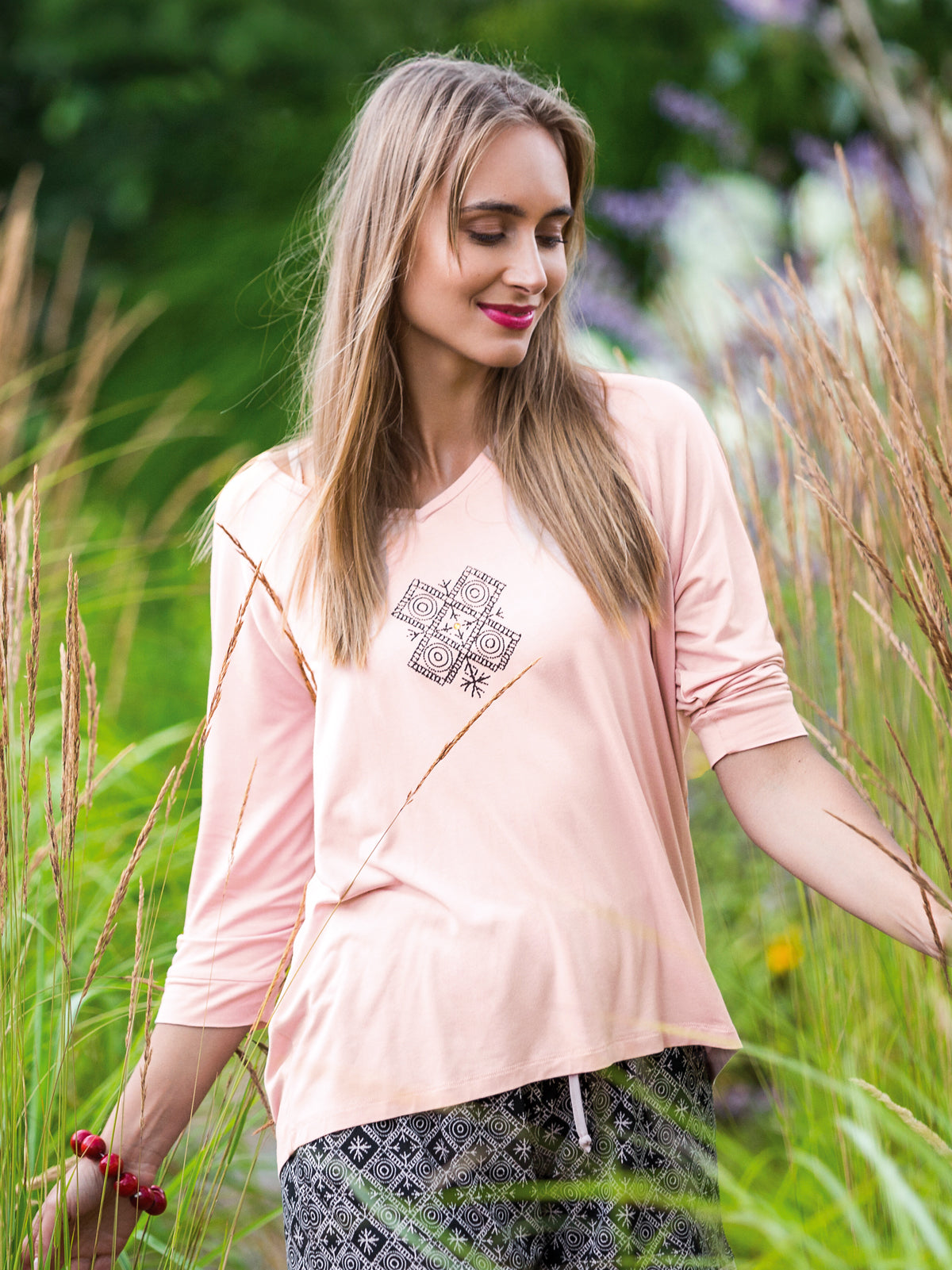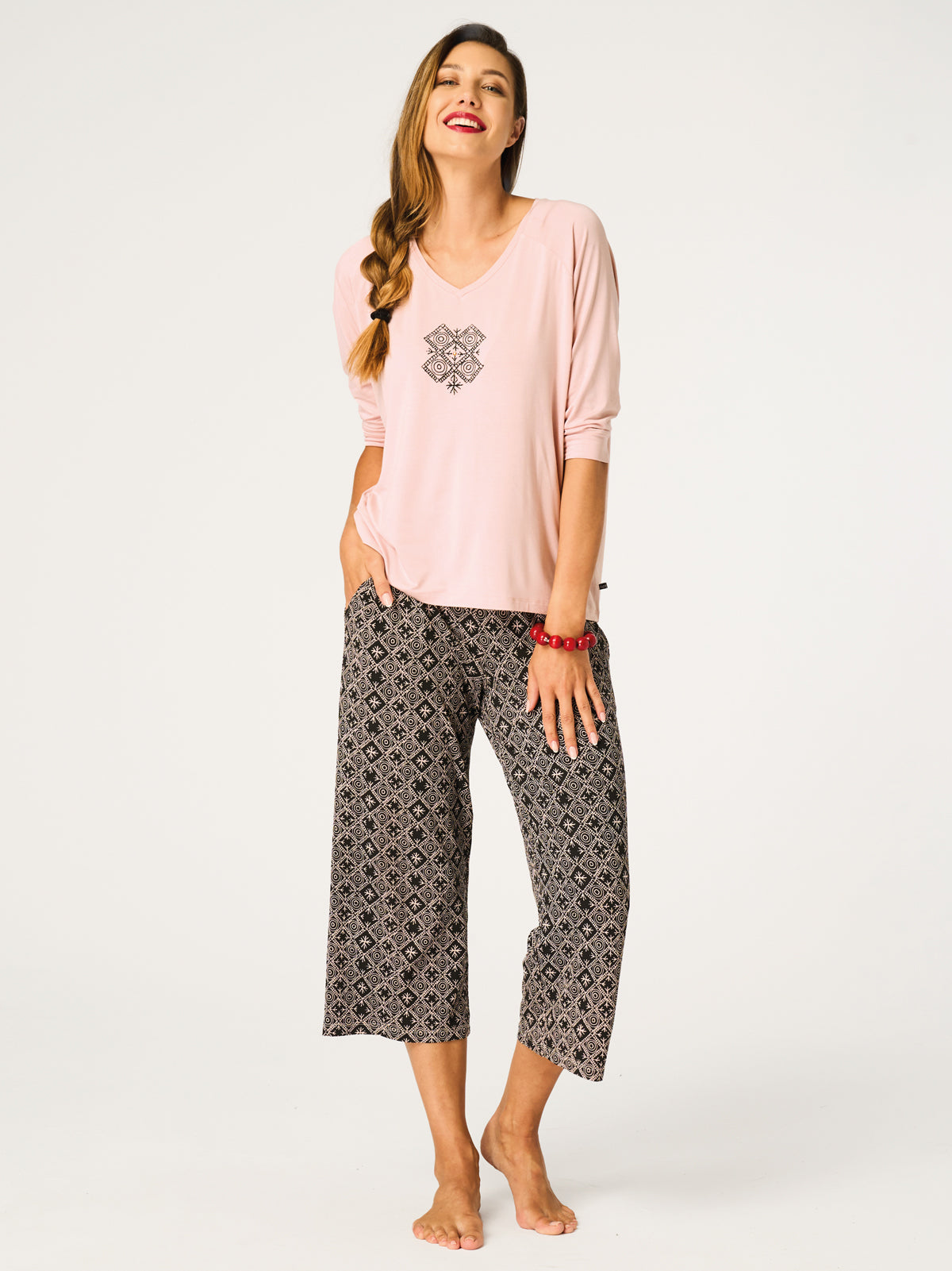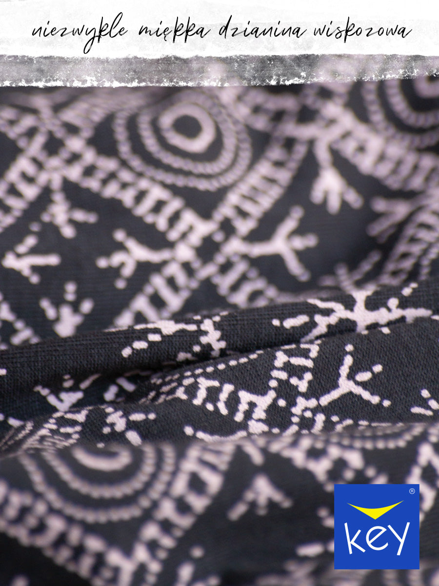 Bluzka ma luźny krój z obniżoną linią rękawa sięgającego za łokieć, co nadaje jej lekkości i swobody ruchu. Otwarty, głęboki dekolt w kształcie litery V podkreśla kobiecość i subtelny szyk piżamy. Na środku bluzki znajduje się etno kompozycja z uroczą cyrkonią w centrum, dodająca eleganckiego blasku. Prosta, luźna nogawka spodni o długości 7/8 zapewnia pełną swobodę ruchu. W pasie spodni zastosowano miękką gumę, a głębokie kieszenie zwiększają funkcjonalność i wygodę podczas codziennego noszenia.
