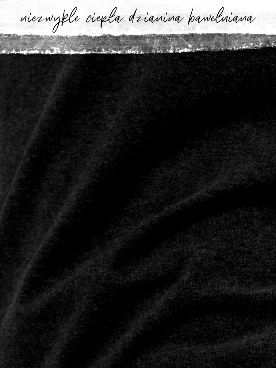 Skład dzianiny: 95% bawełna, 5% elastan, dzianina drapana z obu stron, wysokie odczucie ciepła.