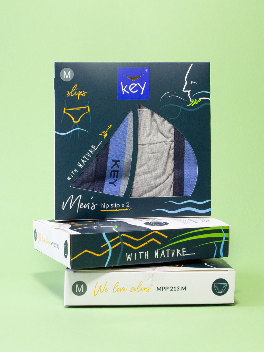 Klasyczne slipy męskie Key w zestawie 2 sztuk to połączenie wygody, sportowego stylu i ponadczasowej kolorystyki – szarości oraz ciemnego, stonowanego granatu.