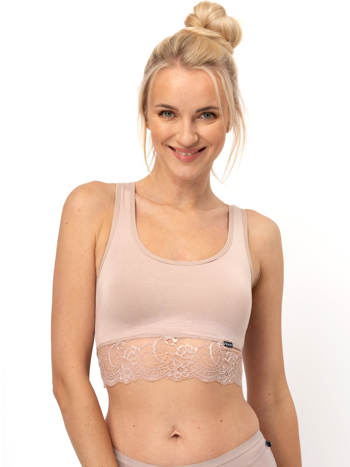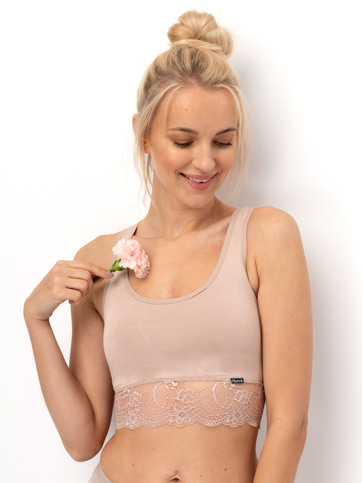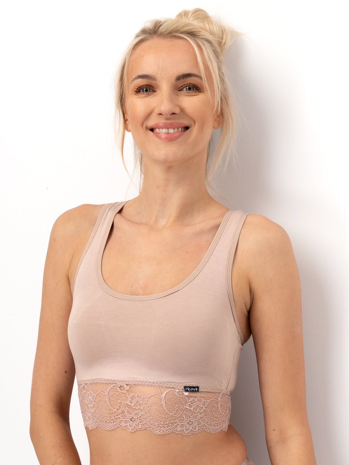 Wygodny romantyczny top, wykończony mięciutką i elastyczną koronką dla Kobiet, które cenią wygodę i cudowną miękkość w każdy dzień roku. Z przodu podwójna warstwa dzianiny doskonale okala biust. Dodatkowo tworzy miejsce na wyjmowaną miseczkę. Pod biustem miękka 7 cm koronka. Dekolt i ramiona wykończone miękką lamówką. Z tyłu lamówki ramiączek krzyżują się co zapobiega opadaniu ramiączek i daje pełną swobodę i pewność przy każdym ruchu.