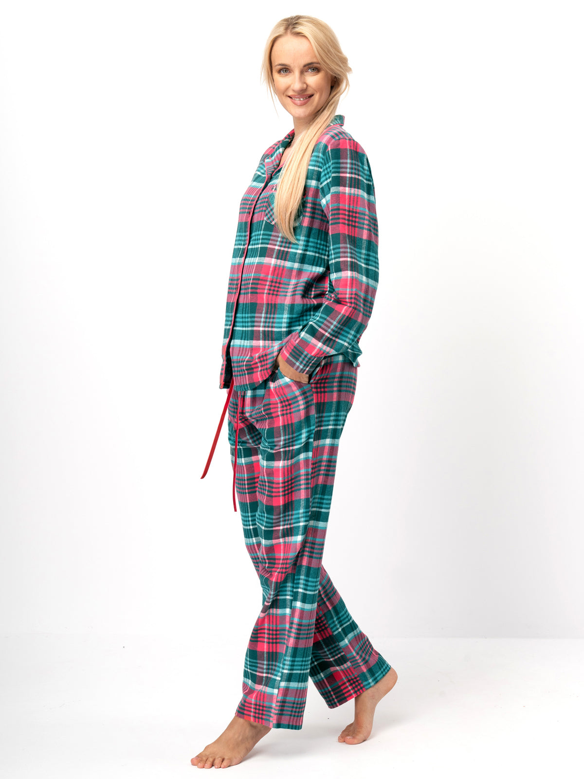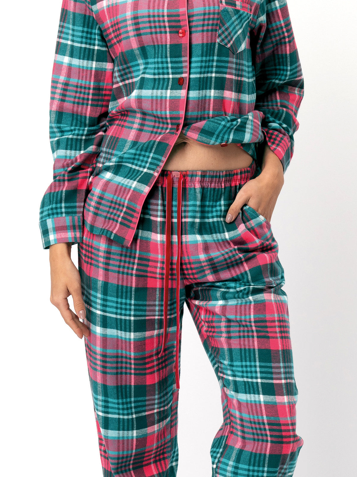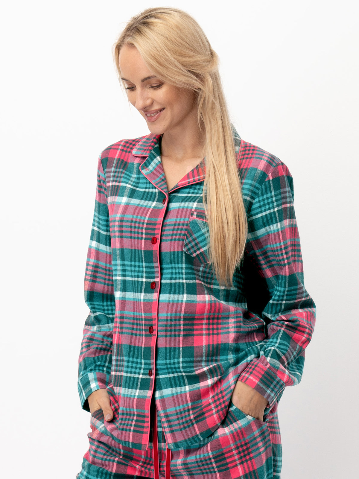 Ciepła i cudownie przyjemna w dotyku tkanina flanelowa ogrzeje Twoje Ciało w chłodne jesienne i zimowe noce. Rozpinana koszulowa góra z klasycznym kołnierzykiem ma długość do dolnej linii pośladków. Rękaw wykończony prostym, eleganckim mankietem. Urocze połyskujące kwadratowe guziczki i czerwona lamówka dodają piżamce uroku i bożonarodzeniowego klimatu. Długie spodnie z miękką gumą w pasie i ozdobną tasiemką to klasyczny krój. Prosta nogawka zapewnia swobodę ruchów podczas regenerującego snu. Flanelowy komplet to ponadczasowa propozycja dla Kobiet. Włókna w 100% bawełniane wysokiej jakości w połączeniu z odpowiednim ściegiem i nićmi dają trwałe i długie użytkowanie.