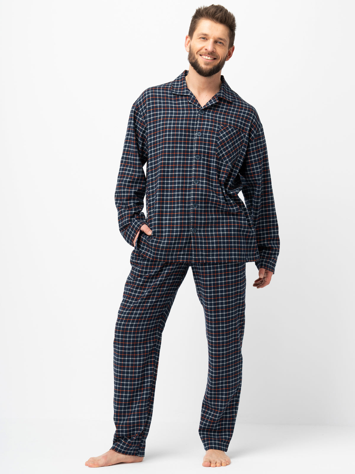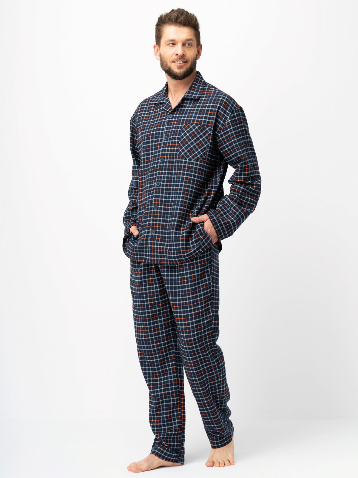 Stonowany odcień granatu z bielą i oranżem w harmonijnej kompozycji drobnej kraty. Ciepła i cudownie przyjemna w dotyku tkanina flanelowa ogrzewa Twoje Ciało w chłodne zimowe noce. Naturalna flanela wspiera zdrowie w jesienny i zimowy czas. Włókna w 100% bawełniane wysokiej jakości w połączeniu z odpowiednim ściegiem i nićmi dają trwałe i długie użytkowanie piżamy. Koszula zapinana na guziki z kołnierzykiem i kieszonką na piersi. Dyskretny guziczek, umożliwia zapięcie koszuli wysoko przy szyi. Wygodne spodnie o kroju lekko zwężającej się nogawki mają w pasie mają wygodną, miękką gumę i wygodny, funkcjonalny troczek. Po bokach głębokie kieszenie. Wyjątkowo elegancka piżama! Całość miękka, dająca swobodę Twojemu Ciału, zapewnia spokojny, Zdrowy sen.