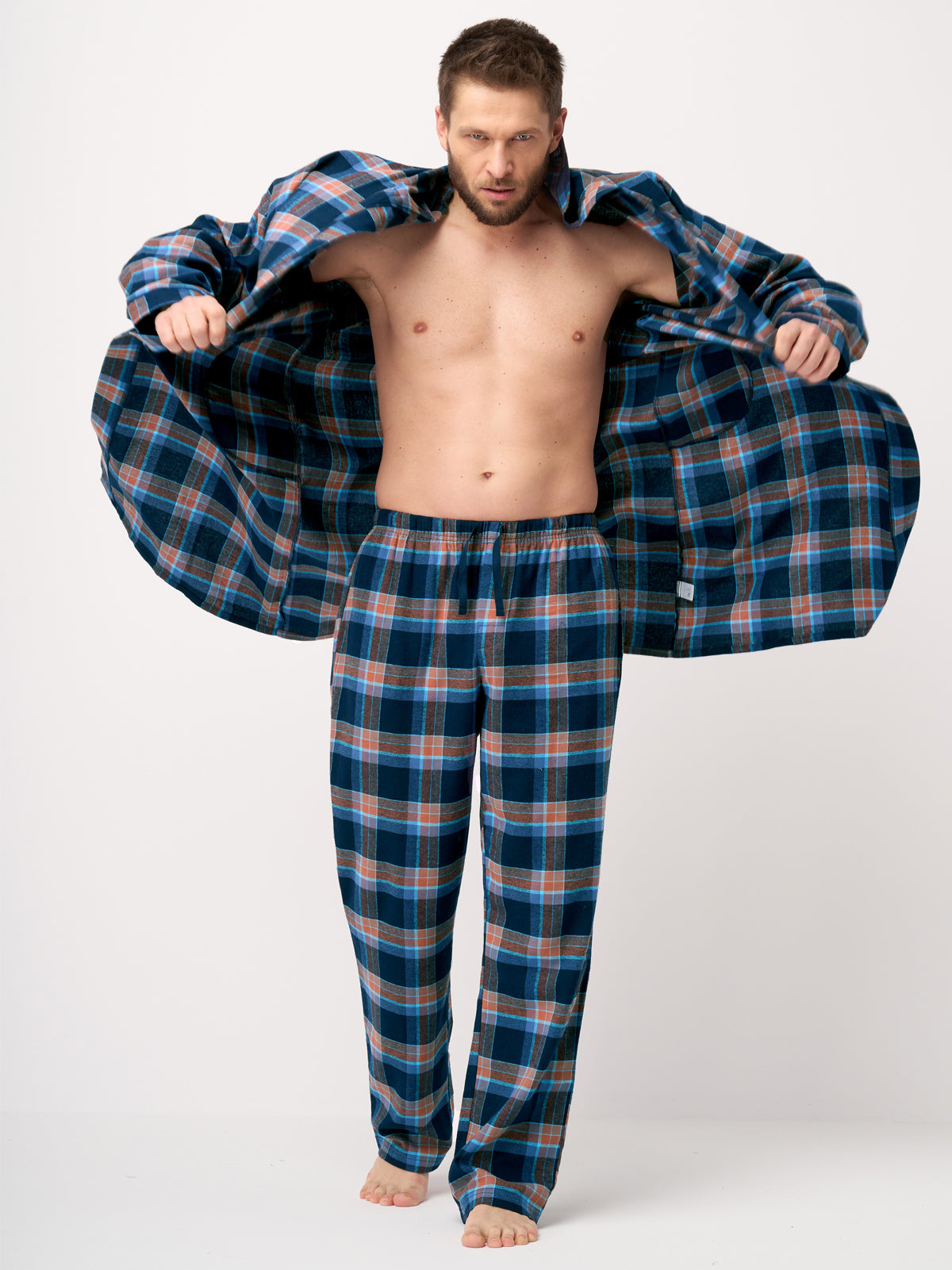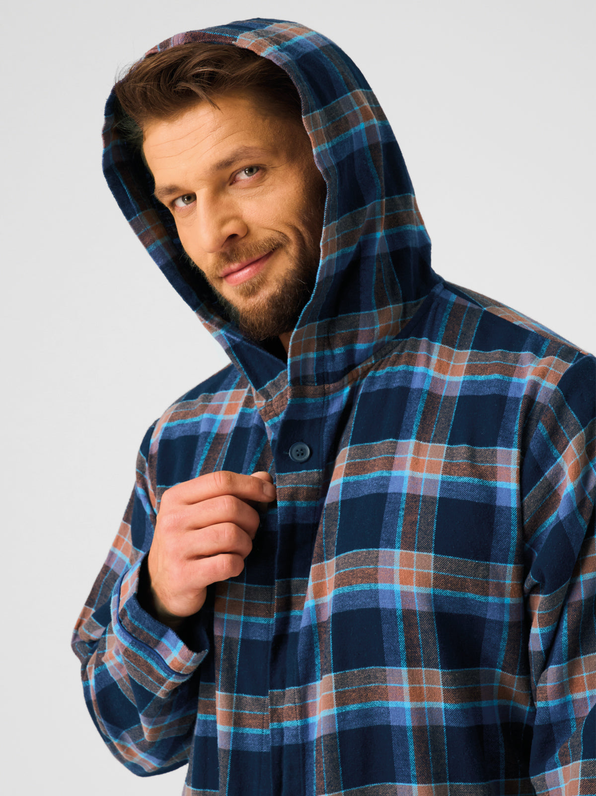 Przepiękne połączenie głębokiego granatu i czekoladowego brązu wprawią Ciebie i Twoje ciało w doskonały nastój. Wykonany z bardzo miękkiej w dotyku i ciepłej tkaniny flanelowej, która szybko ogrzeje Twoje ciało w chłodne noce i poranki. A wiosną i latem da naturalną ochronę dla Ciała, zapewniając jej oddech. Tradycyjny krój wzdłuż linii ramienia sprawia, że szlafrok jest blisko linii Ciała i miękko układa się na sylwetce. Bardzo wygodny i praktyczny - posiada kaptur, głębokie boczne kieszenie i pasek. Przy szyi dyskretny guziczek, który umożliwia zapięcie szlafroka wysoko i osłonięcie klatki piersiowej. Długość za kolano. Włókna w 100% bawełniane wysokiej jakości w połączeniu z odpowiednim ściegiem i nićmi dają komfortowe, trwałe i długie użytkowanie. Szlafrok świetnie sprawdzi się jako domowe okrycie po kąpieli, do porannej kawy czy wieczornego relaksu. Dzięki zastosowanym bawełnianym włóknom szlafrok szybko chłonie wilgoć i przepuszcza powietrze do skóry, doskonały na wilgotne ciało. Jest lekki i zajmuje niewiele miejsca – doskonały w podróży lub jako okrycie na basen/saunę. Dobrze leży, nie mechaci się i łatwo się pierze. Może być też eleganckim prezentem dla mężczyzny w każdym wieku. Ponadczasowa, naturalna i Zdrowa Flanela to doskonały zamiennik dla tradycyjnych szlafroków - jest prawie niewyczuwalny, ale wciąż bardzo ciepły.