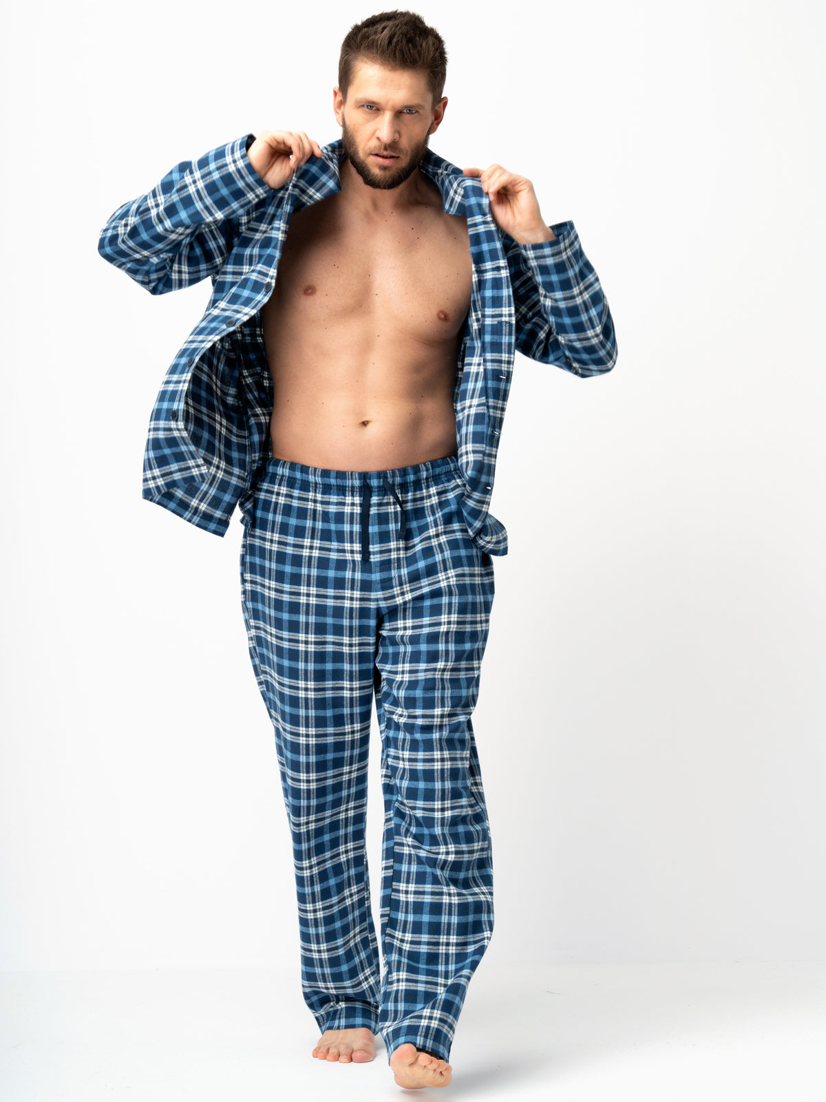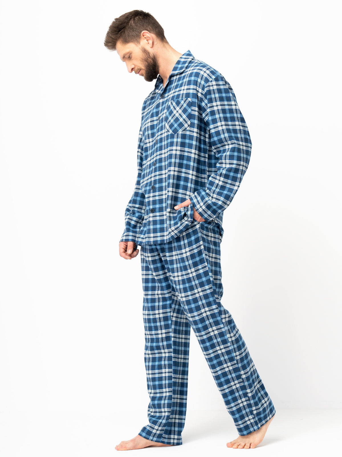 Męska flanelowa piżama w niebieską kratę – ciepła i wygodna na zimę.